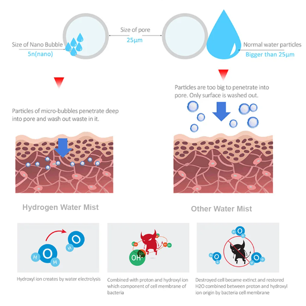 • Micro-Particle Advancement: Nano-sized hydrogen bubbles in the mist deeply cleanse and hydrate skin by penetrating pores more effectively than regular water particles.